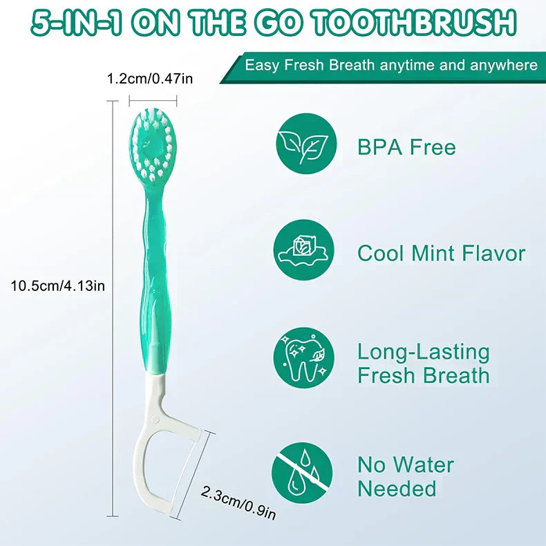 Experience the ultimate oral care solution with this versatile mini toothbrush that combines five essential functions to keep your smile fresh and healthy on the go.